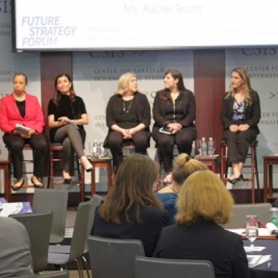 In photo: A 2018 Future Strategy Forum panel featuring (l-r) Beverly Kirk, Captain Asha Castleberry, Shamila Chaudhary, Janne Nolan, Sara Plana, Rachel Tecott, and Tamara Cofman Wittes.